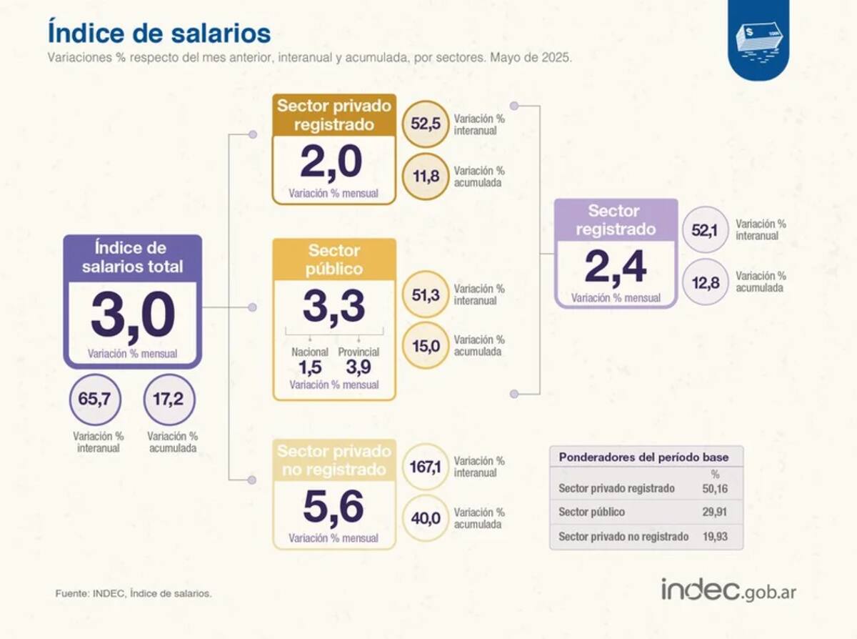 El Instituto Nacional de Estadística y Censos (INDEC) indicó que los salarios crecieron 3% en mayo de 2025. Teniendo en cuenta que la inflación de ese mes fue de 1,5%; la suba de los sueldos duplicó a al IPC.