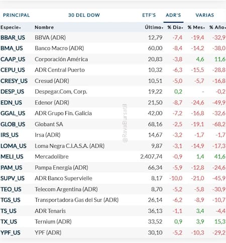A dicho tridente le siguen BBVA (-7,4%); Grupo Financiero Galicia (-7,2%); ADR Central Puerto (-6,3%) y Transportadora Gas del Sur (-6,2%).