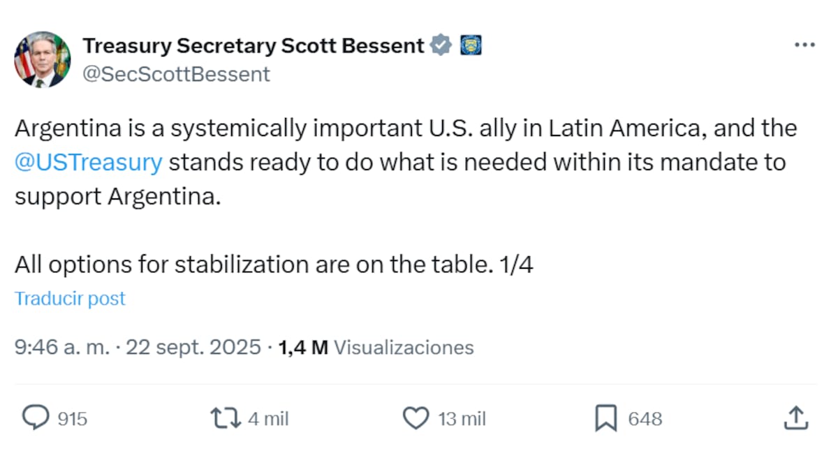 El funcionario destacó además que las oportunidades para la inversión privada “siguen siendo amplias” y remarcó que “Argentina volverá a ser grande”, un mensaje que respondió el ministro de Economía, Luis Caputo: “Gracias Secretario Scott Bessent por su invaluable apoyo y compromiso para ayudarnos a hacer grande a Argentina nuevamente!”.