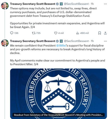 A través de una serie de mensajes publicados en la red X, Bessent sostuvo que “todas las opciones para la estabilización están sobre la mesa”, entre ellas líneas de swap, compras directas de divisas y adquisición de deuda soberana en dólares mediante el Fondo de Estabilización de Cambio del Tesoro.