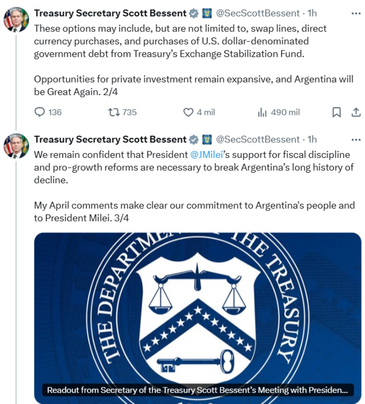 Según la agencia Reuters, Bessent reiteró que todas las opciones de estabilización están sobre la mesa, como líneas de swap, compras directas de divisas y compras de deuda gubernamental denominada en dólares estadounidenses a través del Fondo de Estabilización Cambiaria del Tesoro.