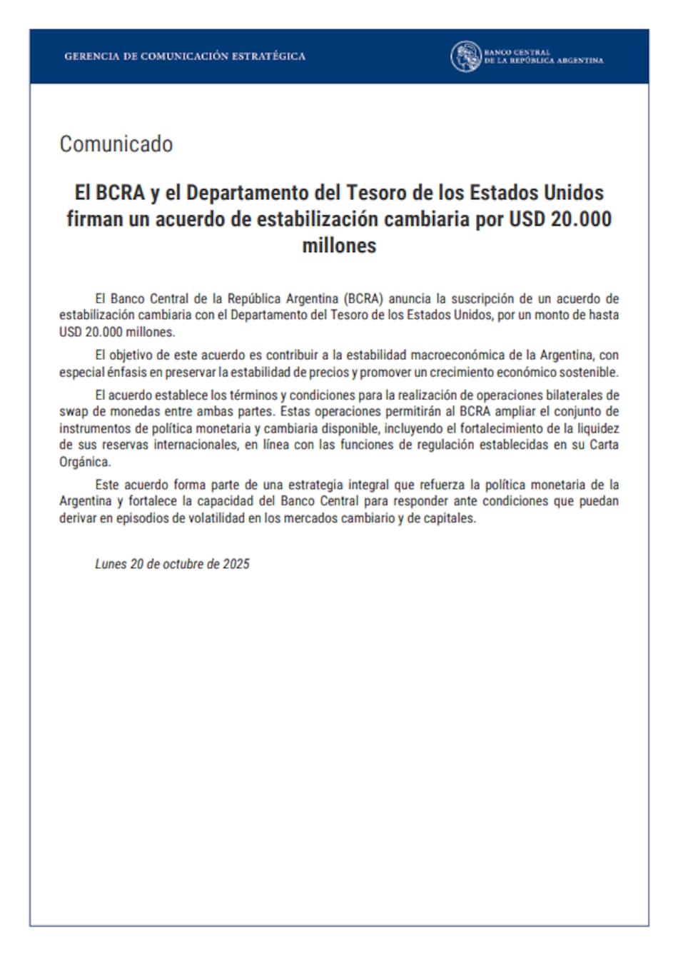 “El Banco Central de la República Argentina (BCRA) anuncia la suscripción de un acuerdo de estabilización cambiaria con el Departamento del Tesoro de los Estados Unidos, por un monto de hasta US$ 20.000 millones”, señaló la entidad que preside Santiago Bausili.