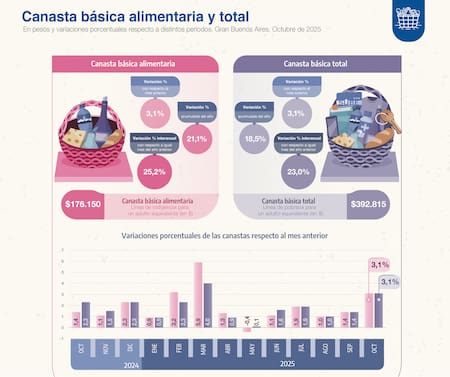 Por su parte, la Canasta Básica Alimentaria (CBA), que determina los ingresos que se deben superar para no ser indigente, también subió un 3,1% en octubre.