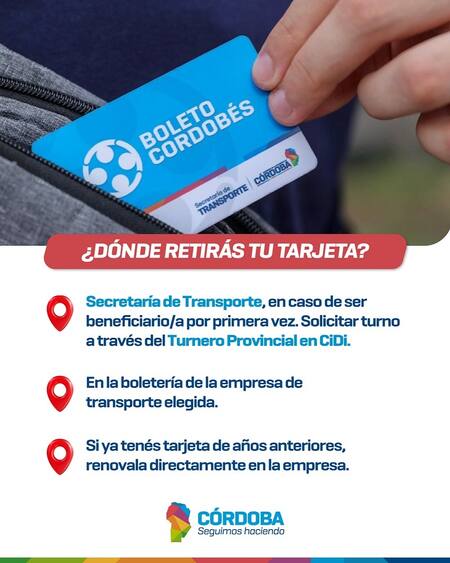 Quienes obtengan el BAM por primera vez deben solicitar un turno a través del Turnero Provincial en CiDi y luego asistir a la Secretaría de Transporte. También, es posible retirar la tarjeta en la boletería de la empresa de transporte elegida.