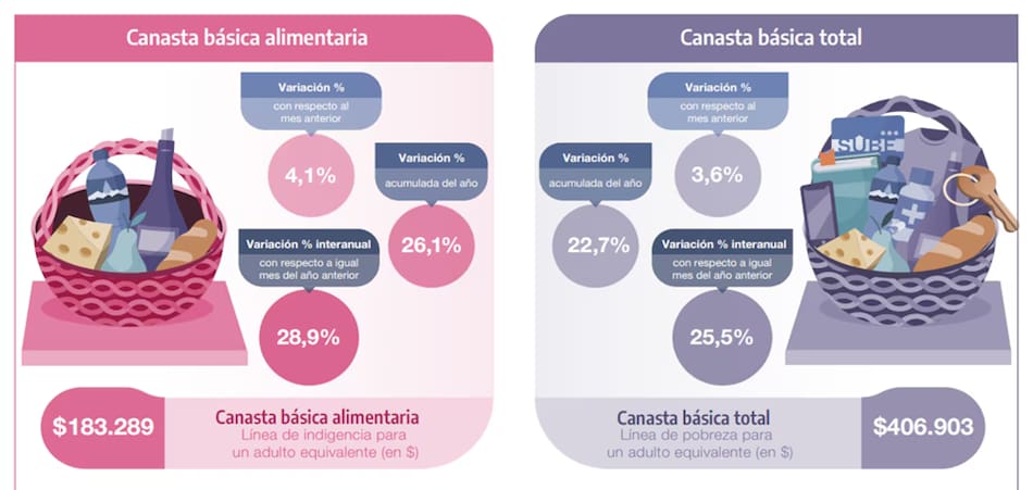 Según lo informado por el INDEC, la variación mensual fue de 4,1% para la Canasta Básica Alimentaria (CBA) y de 3,6% para la Canasta Básica Total (CBT).