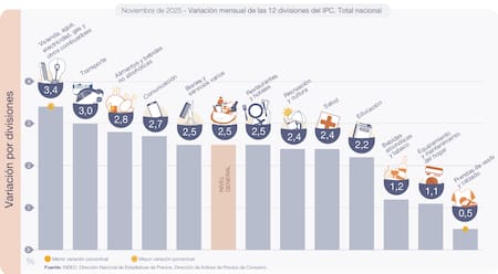 Según señaló el Instituto Nacional de Estadística y Censos de la República Argentina, la división con mayor alza mensual en noviembre de 2025 fue Vivienda, agua, electricidad, gas y otros combustibles (3,4%). En segundo lugar se ubicó Transporte (3%), seguido por Alimentos y bebidas no alcohólicas (2,8%).