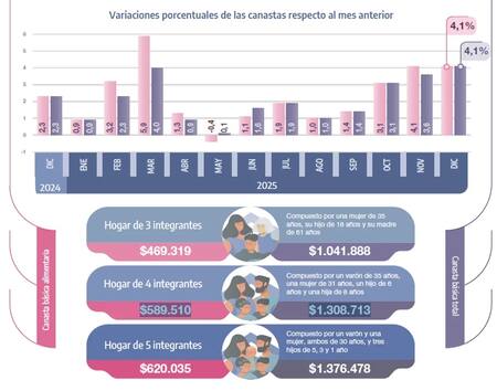 En tanto, la canasta alimentaria, que sirve para estima la indigencia, también se elevó 4,1% y acumuló un alza del 31% en el 2025.