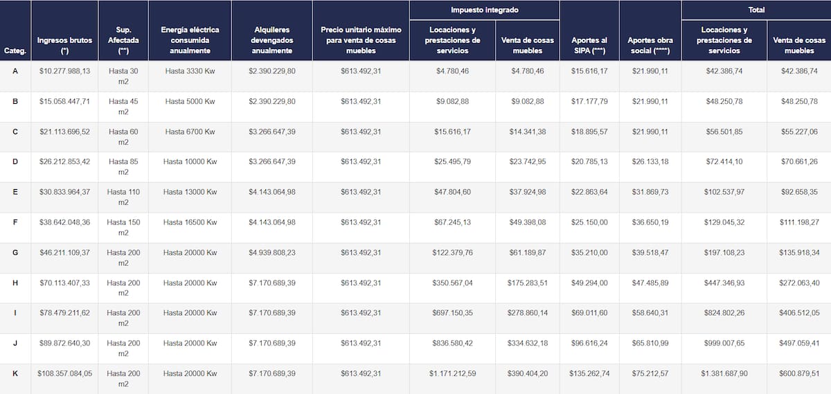 Con la modificación, el tope anual de facturación del monotributo de la Categoría A pasa de $8.992.597 a $10.277.988. Y la Categoría K de $94.805.682 a $108.357.083 anuales.