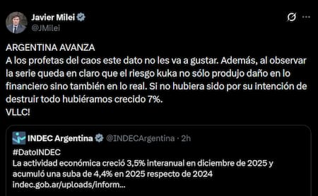 El Instituto de Estadística y Censos (INDEC) señaló este martes que la actividad económica cerró el 2025 con una suba del 4,4%. Ante este indicador, desde el Gobierno señalaron los números, siendo Javier Milei uno de primeros en pronunciarse.