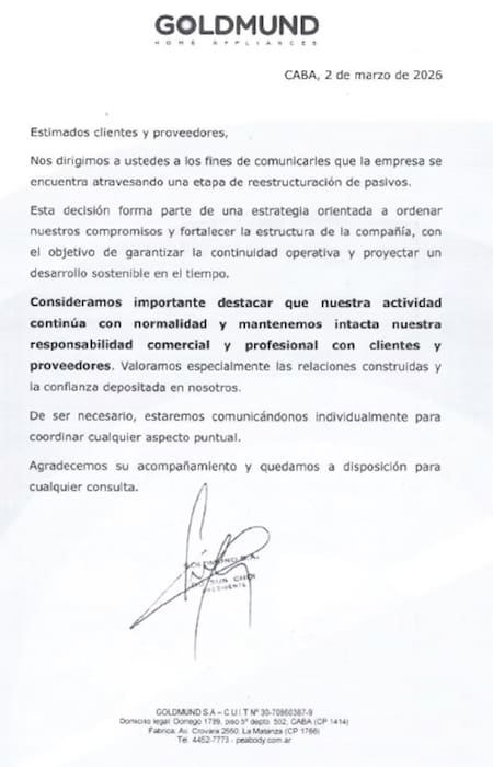 En la carta enviada a clientes y proveedores, Goldmund explicó que se encuentra “atravesando una etapa de reestructuración de pasivos” y que la decisión “forma parte de una estrategia orientada a ordenar los compromisos y fortalecer la estructura de la compañía, con el objetivo de garantizar la continuidad operativa y proyectar un desarrollo sostenible en el tiempo”.