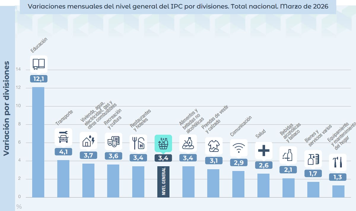 Según el informe del INDEC, la división con mayor alza mensual en marzo de 2026 fue Educación (12%), coincidiendo con el inicio de clases.