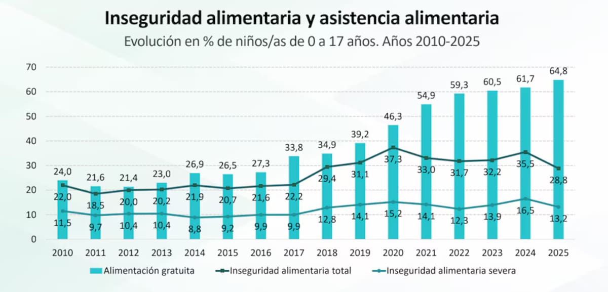 En este sentido, los números de inseguridad alimentaria afectan al 28,8% de los menores del país, de los cuales un 13,2% padecen privaciones alimentarias severas. Por su parte, la asistencia alimentaria gratuita que incluye la Tarjeta Alimentar y los comedores, llegó al 64,8%, lo que marcó un hecho histórico. Más de seis de cada diez niños dependen de la ayuda externa para cubrir sus necesidades básicas.