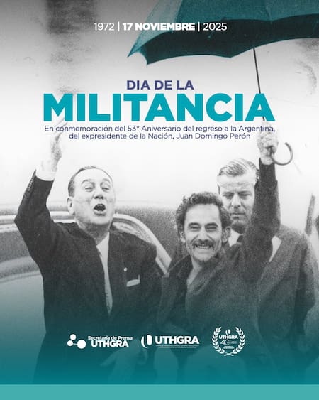“Este 17 de noviembre, Día de la Militancia, desde la UTHGRA conmemoramos el 53° aniversario del regreso a la Argentina del expresidente Juan Domingo Perón, acontecimiento que marcó la lealtad de los trabajadores y de la gran mayoría del pueblo argentino con el máximo exponente del movimiento justicialista".