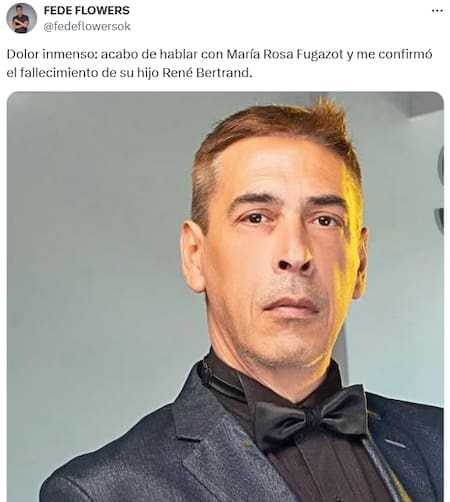 “Dolor inmenso: acabo de hablar con María Rosa Fugazot y me confirmó el fallecimiento de su hijo René Bertrand”, escribió en su cuenta de X el periodista Fede Flowers.