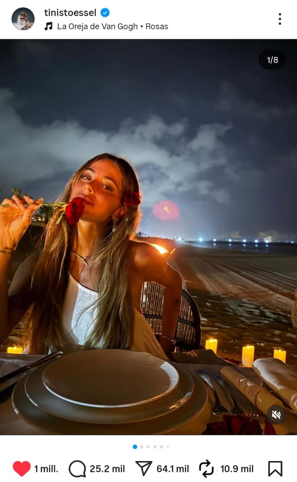 Pero lo que más llamó la atención fue una historia que Tini subió a su cuenta de Instagram: una imagen de pétalos de rosas rojas sobre la arena, mientras de fondo sonaba el clásico romántico de Luis Miguel, “Por Debajo de la Mesa”. El gesto fue interpretado como una posible propuesta romántica, quizás incluso matrimonial, lo que desató la ilusión entre sus fanáticos.