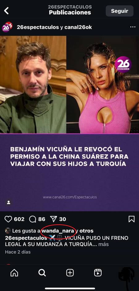 “Benjamín Vicuña le revocó el permiso a la China Suárez para viajar con sus hijos a Turquía”, decía el título de la noticia donde la empresaria dejó su ‘like’. Esta actitud generó vuelo ya que algunos defienden a Wanda Nara mientras que otros mencionan que es un conflicto que parece no tener final.