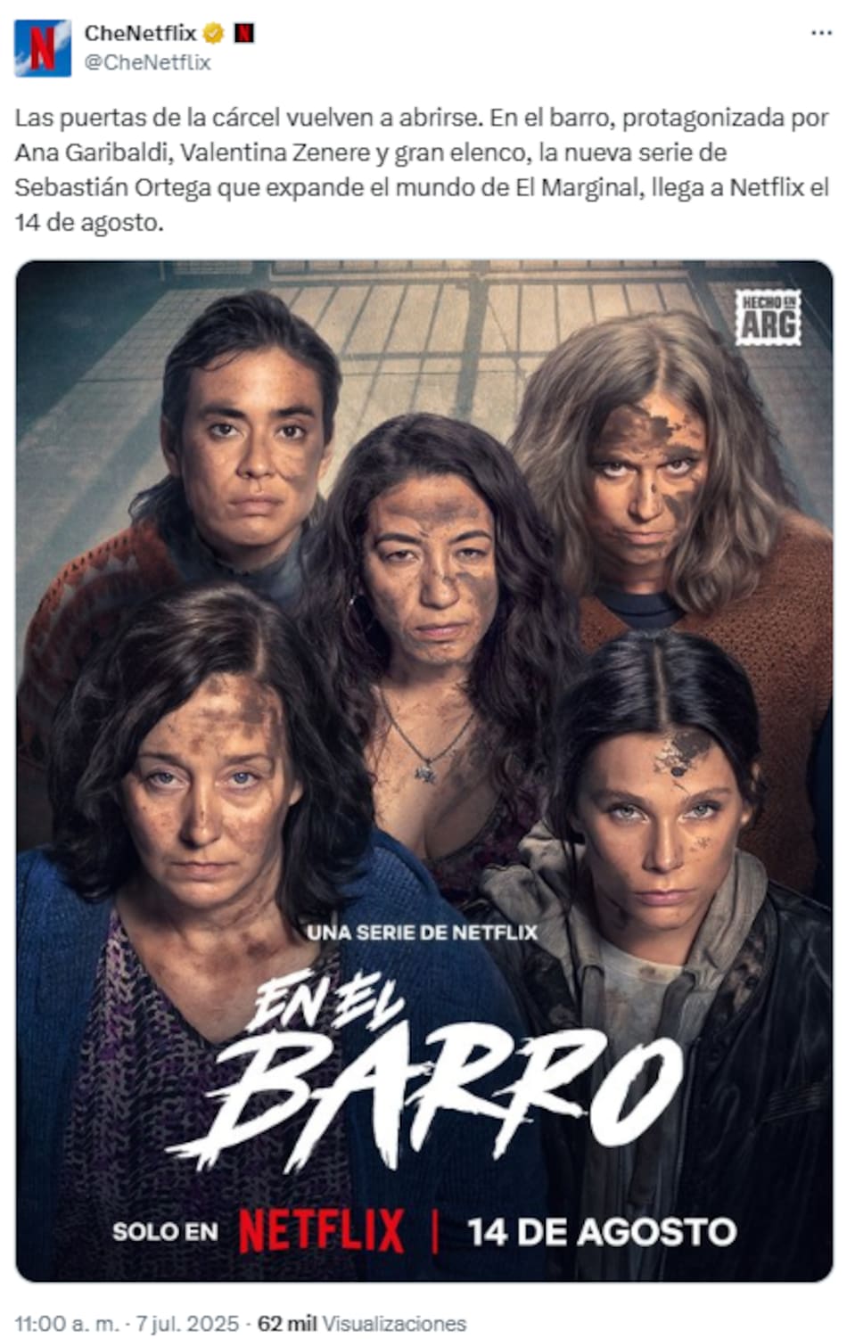 Desde la cuenta oficial de X, Che Netflix escribió: “Las puertas de la cárcel vuelven a abrirse. ‘En el barro’, protagonizada por Ana Garibaldi, Valentina Zenere y gran elenco, la nueva serie de Sebastián Ortega que expande el mundo de ‘El Marginal’, llega a Netflix el 14 de agosto”.