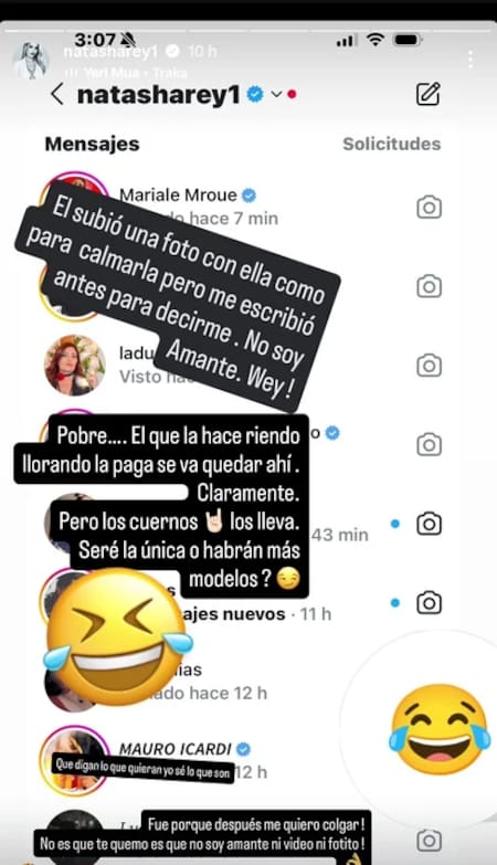 Sin embargo, Natasha publicó una captura de su casilla de mensajes de Instagram, señalando que previo al romántico posteo de Icardi a la China, él se habría comunicado con ella: “Él subió una foto con ella como para calmarla pero me escribió antes para decirme. No soy amante, wey”.