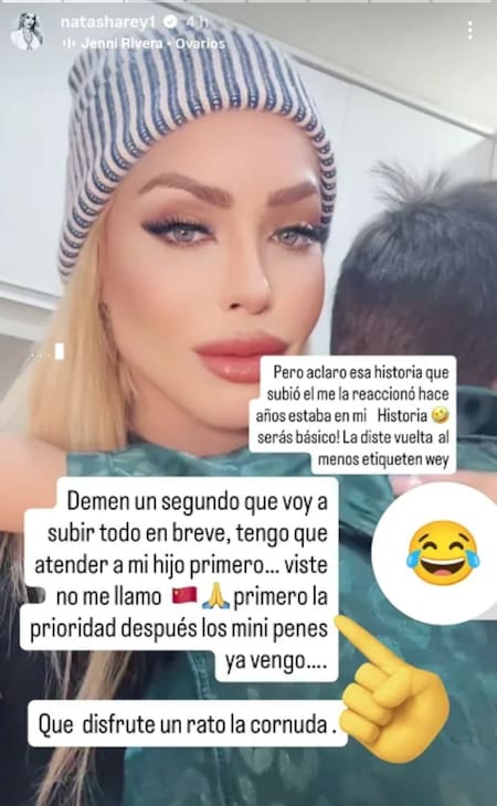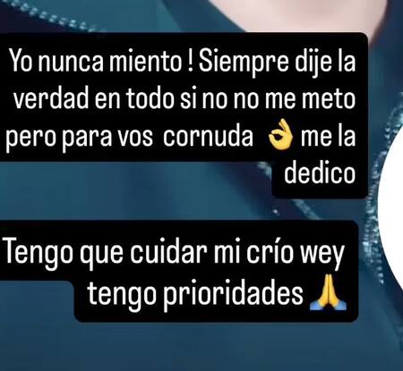 Y disparó: “Yo nunca miento. Siempre dije la verdad en todo si no no me meto, pero para vos cornuda. Me la dedico. Tengo que cuidar mi crío wey, tengo prioridades”.