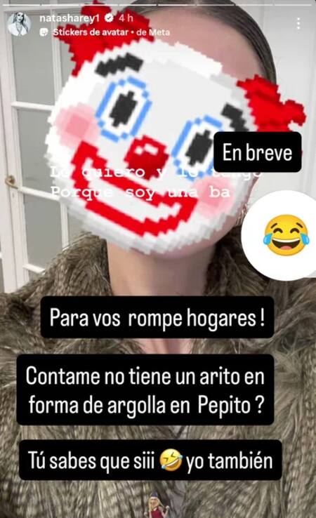 “Para vos rompe hogares. Contame, ¿no tiene un arito de argolla en Pepito? Tú sabes que sii, yo también”, amenazó a la China con una imagen de ella con una máscara de payaso en su cara.