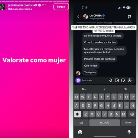“Me estoy por ir a Turquía, necesito que me desmienta todo”, le habría solicitado la ex Casi Ángeles, según una captura de pantalla difundida por Jazmín en sus historias de Instagram. En los supuestos chats, la actriz también le habría reclamado: “No era necesario que se la sigas, o me lo pasabas a mí antes”.