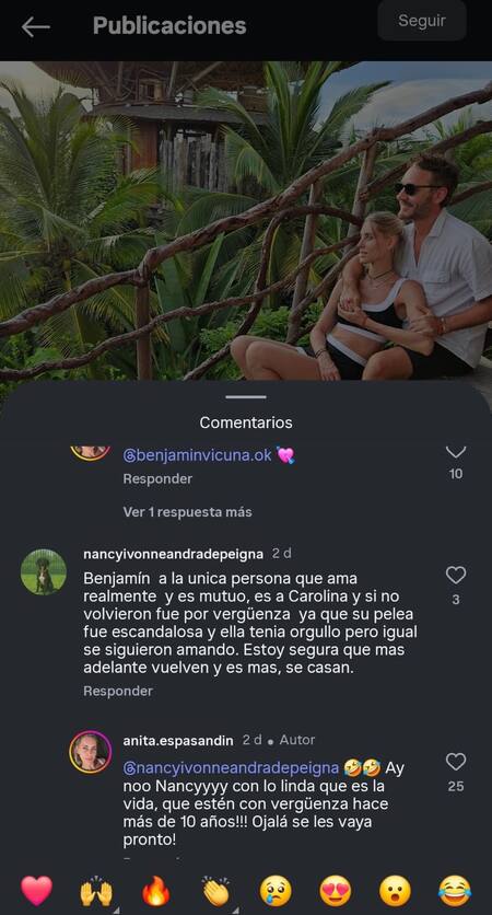 En una publicación reciente donde mostraba distintas postales en un viaje que realizó junto a Vicuña, la modelo recibió el siguiente comentario: “A la única persona que Benjamín ama realmente es a Carolina. Si no volvieron fue por vergüenza ya que su pelea fue escandalosa y ella tenía orgullo”, y agregó: “Se siguen amando, estoy segura que más adelante vuelven y se casan”.