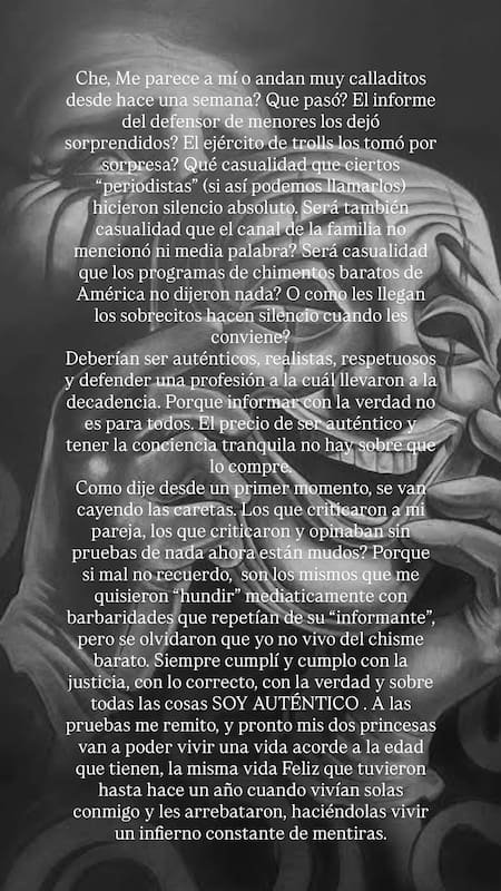“Siempre cumplí y cumplo con la Justicia, con lo correcto, con la verdad y sobre todas las cosas SOY AUTÉNTICO”, escribió. Por último, advirtió que va por la custodia de sus dos hijas: “A las pruebas me remito y pronto mis dos princesas van a poder vivir una vida acorde a la edad que tienen, la misma vida feliz que tuvieron hasta hace un año cuando vivían solas conmigo y les arrebataron, haciéndolas vivir un infierno constante de mentiras”.