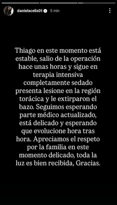 Por otro lado, Alfa y Romina Uhrig, sus ex compañeros de GH, hicieron lo mismo. “Thiaguito, ponete bien loquillo, pronto quiero abrazarte así de nuevo”, escribió Alfa en sus redes sociales, mientras que la ex diputada hizo a un lado sus diferencias con Daniela y posteó en sus redes: “Solo pido que sigan orando por Thiaguito. Gracias de todo corazón”.
