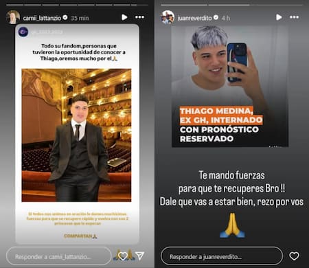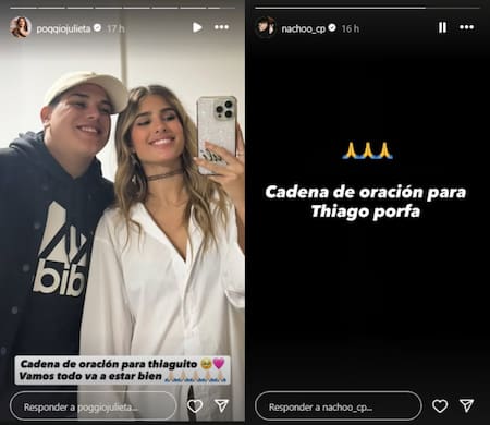 Julieta Poggio y Nacho Castañares, quienes tienen una relación muy cercana a Thiago y su expareja ya que son los padrinos Laia y Aimé, pidieron a sus seguidores rezar por el joven y le brindaron su apoyo a toda su familia.