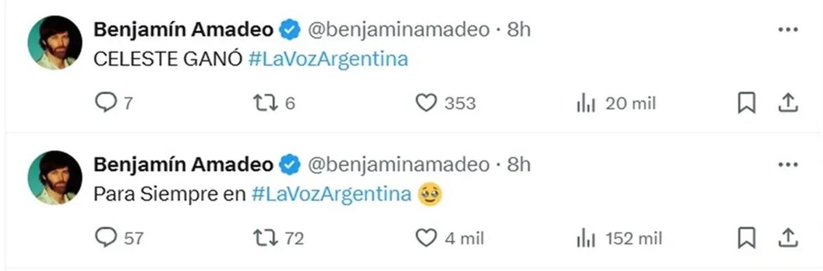 “Celeste ganó #LaVozArgentina” y “Para Siempre en #LaVozArgentina”, escribió el actor y cantante.