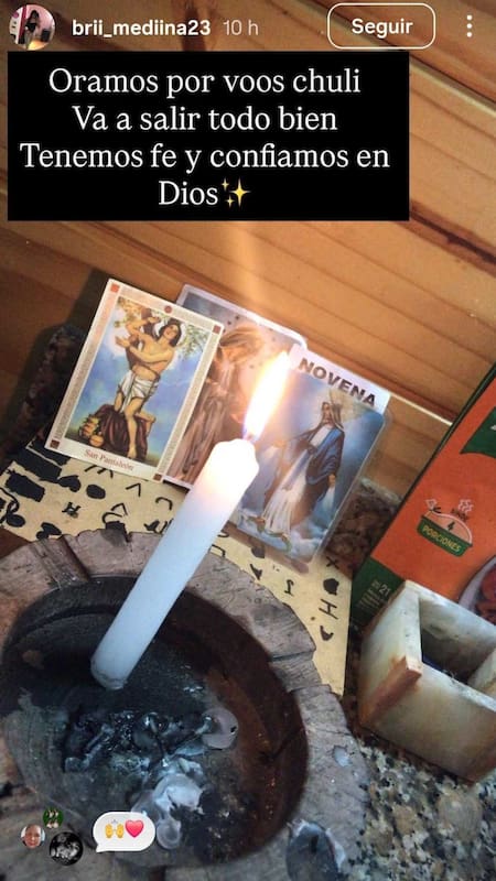 “Oramos por vos Chuli. Va a salir todo bien. Tenemos fe y confiamos en Dios”, escribió junto a una foto donde se observó una vela prendida y tres estampitas alrededor. Su pedido se hizo eco en Daniela Celis, quien también pidió a sus seguidores seguir rezando, ya que asegura que esas pruebas de amor hacen efecto en Thiago.