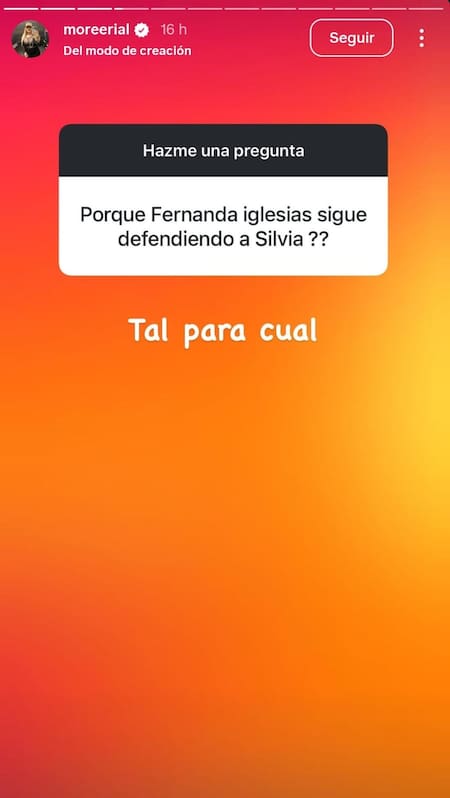 More, lejos de quedarse en silencio, opinó sobre la panelista aprovechando otra de las preguntas de sus seguidores en el mismo box de Instagram. Para ella, tanto Fernanda como su madre son “tal para cual”.
