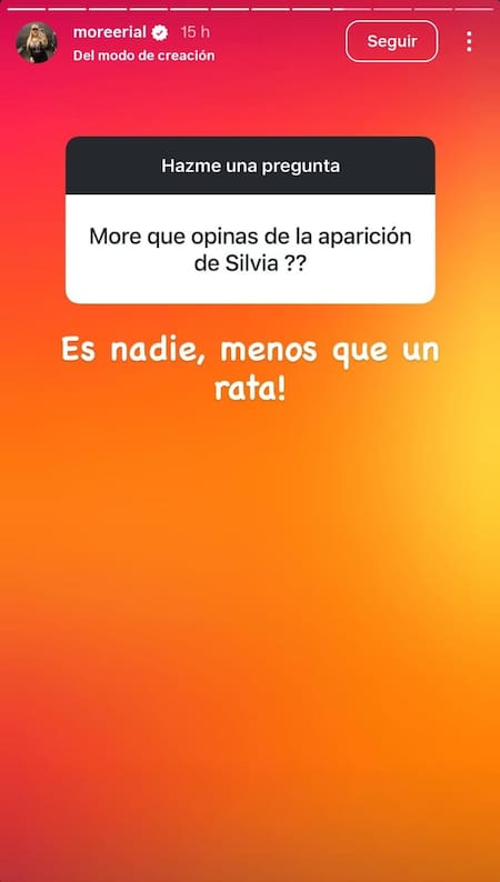 A través de una caja de preguntas en Instagram, Morena fue consultada directamente sobre D’Auro: “More, ¿qué pensás de la aparición de Silvia?”. Sin rodeos, la hija de Jorge Rial respondió: “Es nadie, menos que una rata”, dejando en claro la tensión que mantiene con su madre y recordando un pasado que, según su relato y el de su padre, estuvo marcado por momentos difíciles.