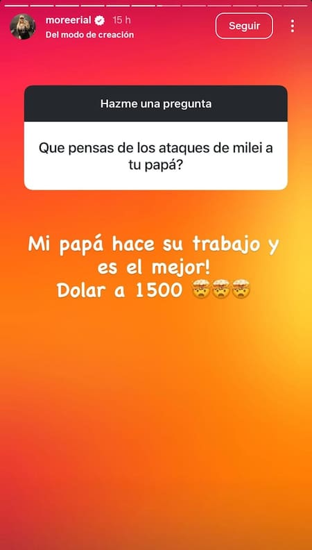 La joven también aprovechó la instancia para referirse a los recientes ataques de Javier Milei hacia su padre. Ante la pregunta: “Qué pensás de los ataques de Milei a tu papá?”, Morena defendió la labor de Jorge Rial: “Mi papá hace su trabajo y es el mejor. Dólar a 1500”, reafirmando su respaldo pese a las diferencias que atravesaron a lo largo de los años.