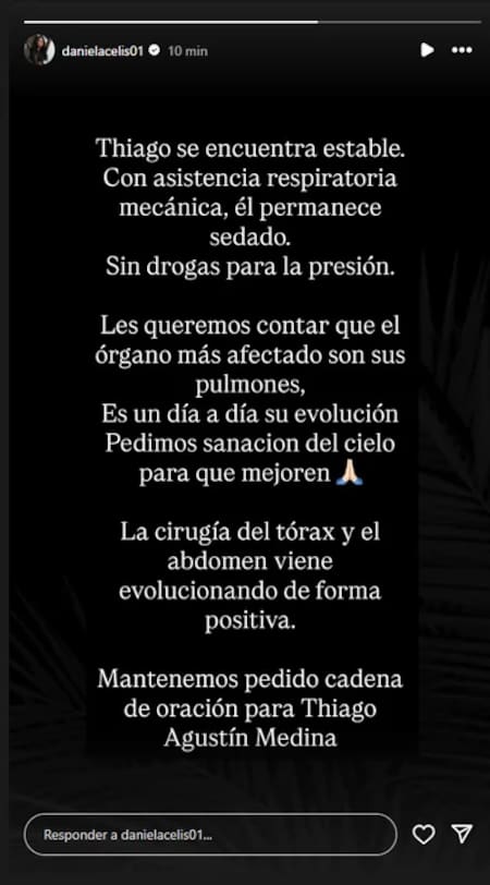 “Pedimos sanación del cielo para que mejoren” sus pulmones, escribió Daniela en un comunicado difundido en sus historias.