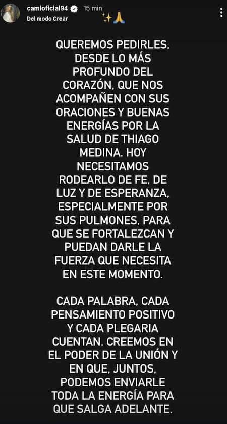 “Queremos pedirles desde lo más profundo del corazón que nos acompañen con sus oraciones y buenas energías por la salud de Thiago Medina”, agregó en el mensaje.