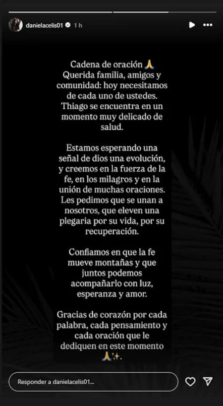 “Cadena de oración. Querida familia, amigos y comunidad: hoy necesitamos de cada uno de ustedes. Thiago se encuentra en un momento muy delicado de salud. Estamos esperando una señal de dios, una evolución, y creemos en la fuerza de la fe, en los milagros y en la unión de muchas oraciones. Les pedimos que se unan a nosotros, que eleven una plegaria por su vida, por su recuperación”, pidió.