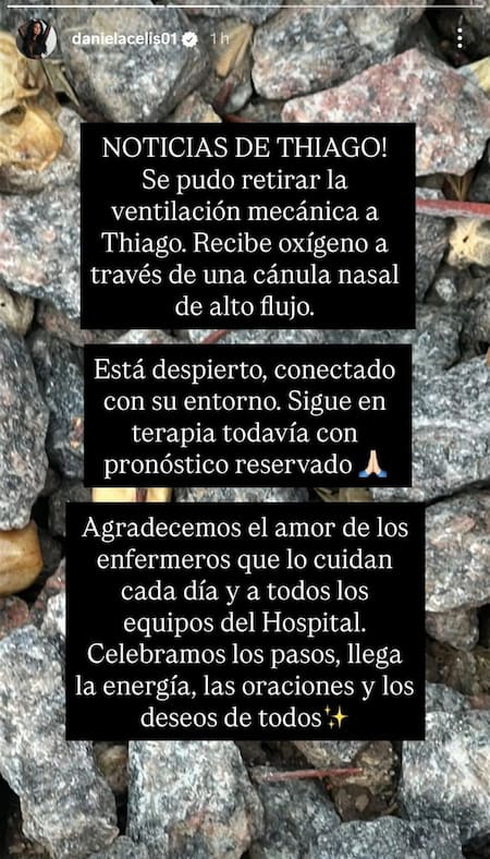 Según relató la influencer a través de un video que subió a su cuenta de Instagram, el joven dejó de depender de la ventilación mecánica y ahora respira con asistencia de una cánula nasal de alto flujo. “Noticias de Thiago. Se pudo retirar la ventilación mecánica a Thiago. Recibe oxígeno a través de una cánula nasal de alto flujo. Está despierto, conectado con su entorno. Sigue en terapia todavía con pronóstico reservado”, expresó.