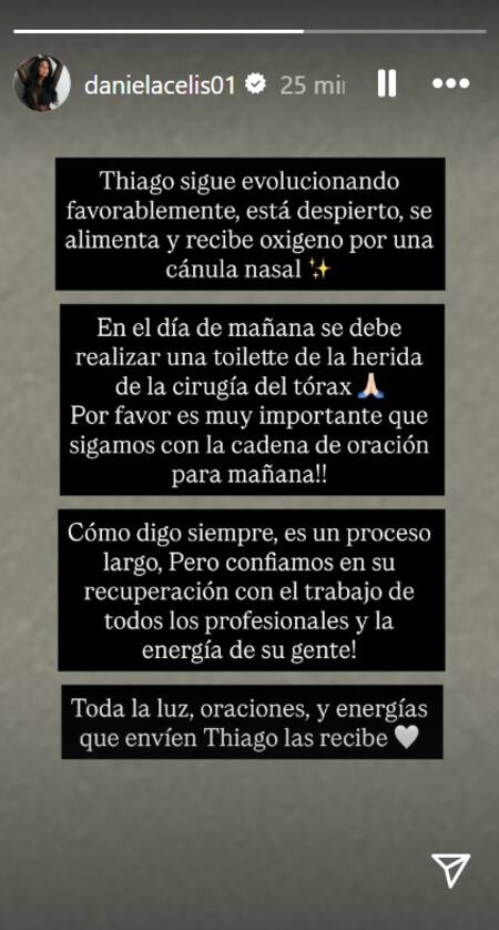 Este miércoles Daniela Celis compartió un nuevo parte de su expareja y papá de sus hijas, Thiago Medina, y dio esperanzas con el avance de la salud, aunque no dejó de pedir cadena de oración para el joven.