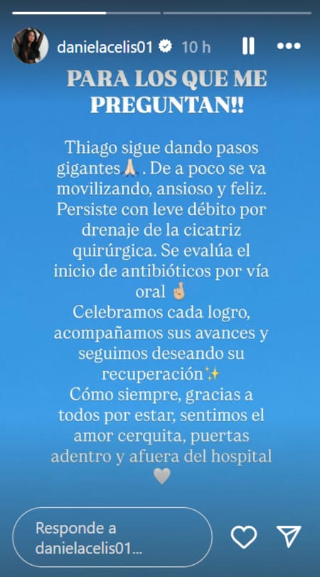 “Para los que me preguntan, Thiago sigue dando pasos gigantes. De a poco se va movilizando, ansioso y feliz”, escribió en una historia de Instagram.