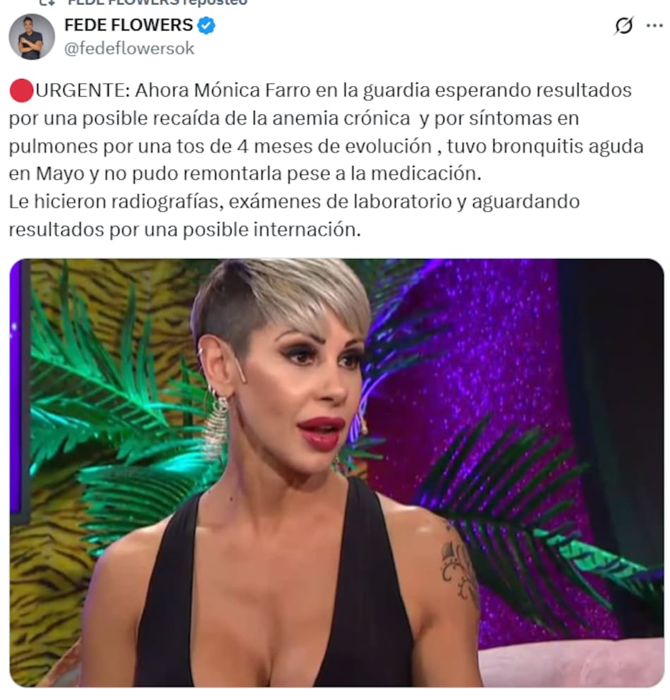 El problema de salud de la uruguaya vendría de hace algunos meses tras sufrir una bronquitis aguda en el mes de mayo. “Mónica Farro en la guardia esperando resultados por una posible recaída de la anemia crónica y por síntomas en pulmones por una tos de 4 meses de evolución”, expresó el periodista.