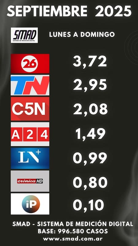 Canal 26 cerró septiembre en 3,72 puntos de rating mientras que TN promedió 2,95 de audiencia. Les siguieron C5N (2,08), A24 (1,49), LN+ (0,99), Crónica TV (0,80) e IP Noticias (0,10).