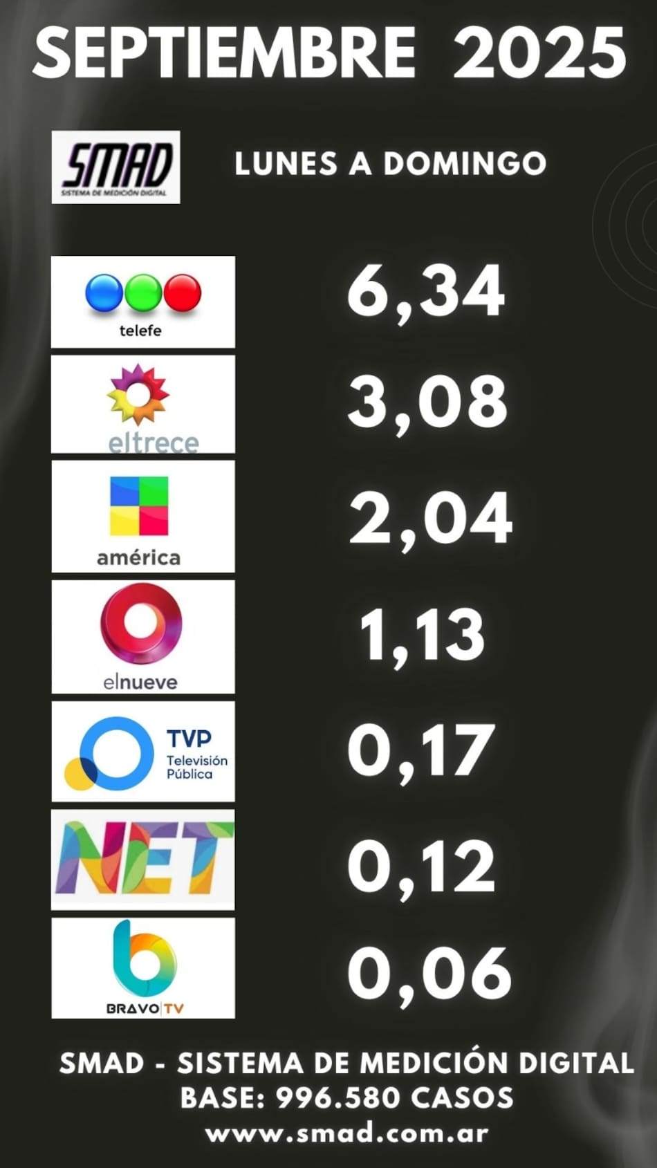 Según datos de SMAD (Sistema de Medición Digital), el viejo Canal 11 conserva la cima del ranking de manera ininterrumpida y en septiembre, los números volvieron a demostrarlo, cerrando en un promedio de audiencia de 6,34 puntos. Un promedio mensual que le permitió duplicar y más a su principal competidor, El Trece, que obtuvo 3,08.