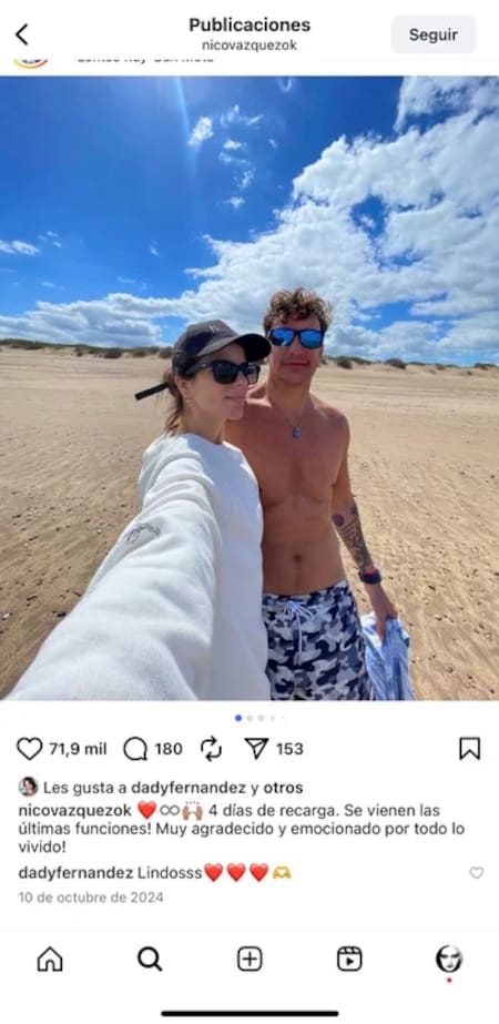 En octubre de 2024 los vio en la playa y les puso “lindos”, mientras que noviembre de 2024, Nico Vázquez publicó una foto con Gimena Accardi y Dai les escribió: “Siempre lindo compartir con ustedes, los quiero mucho”.