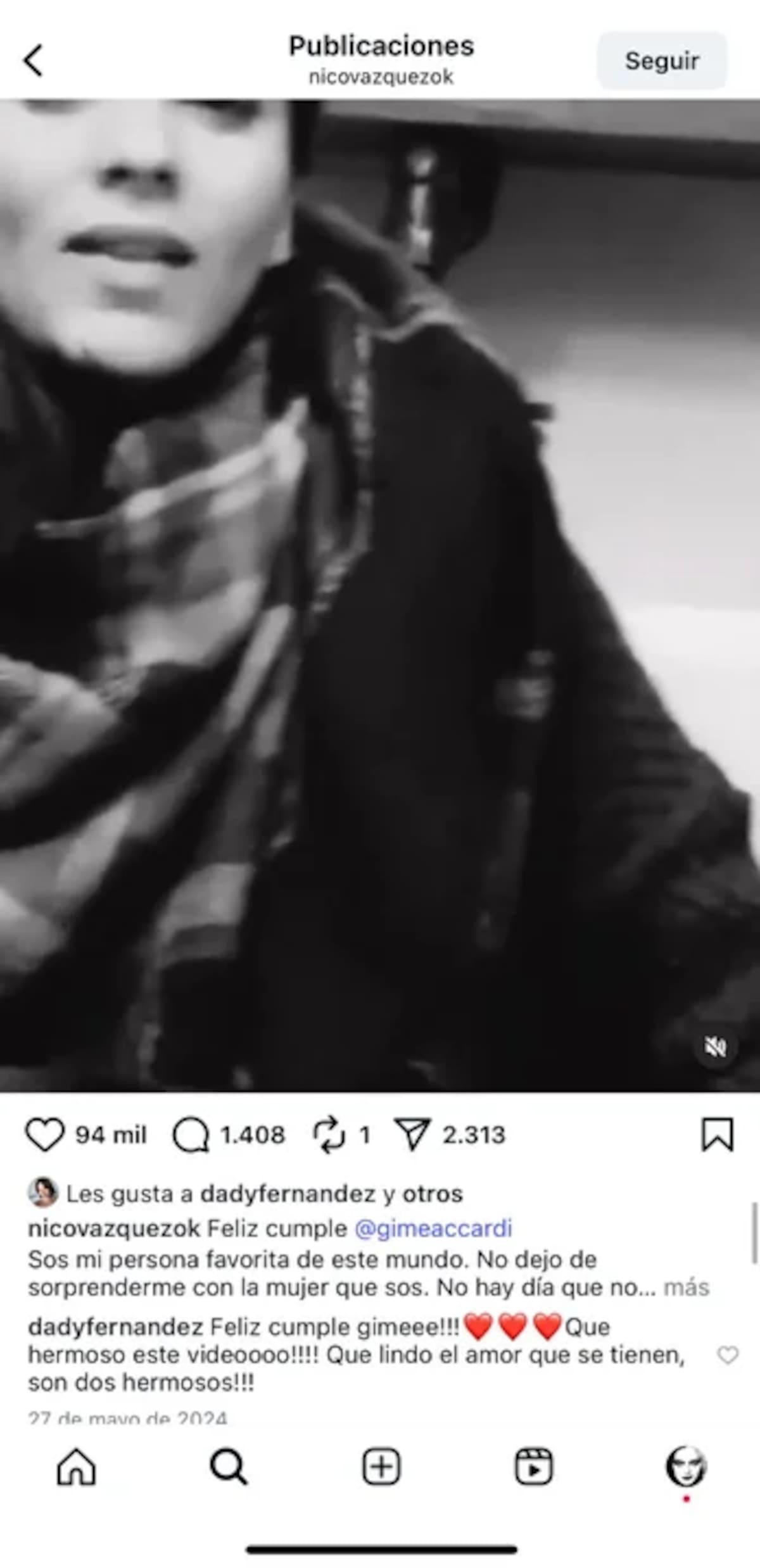En mayo del año pasado, Dai Fernández felicitó a la actriz por su cumpleaños: “Feliz cumple Gime, qué hermoso este video (por uno que le preparó Vázquez especialmente). Qué lindo el amor que se tienen, son dos hermosos”.
