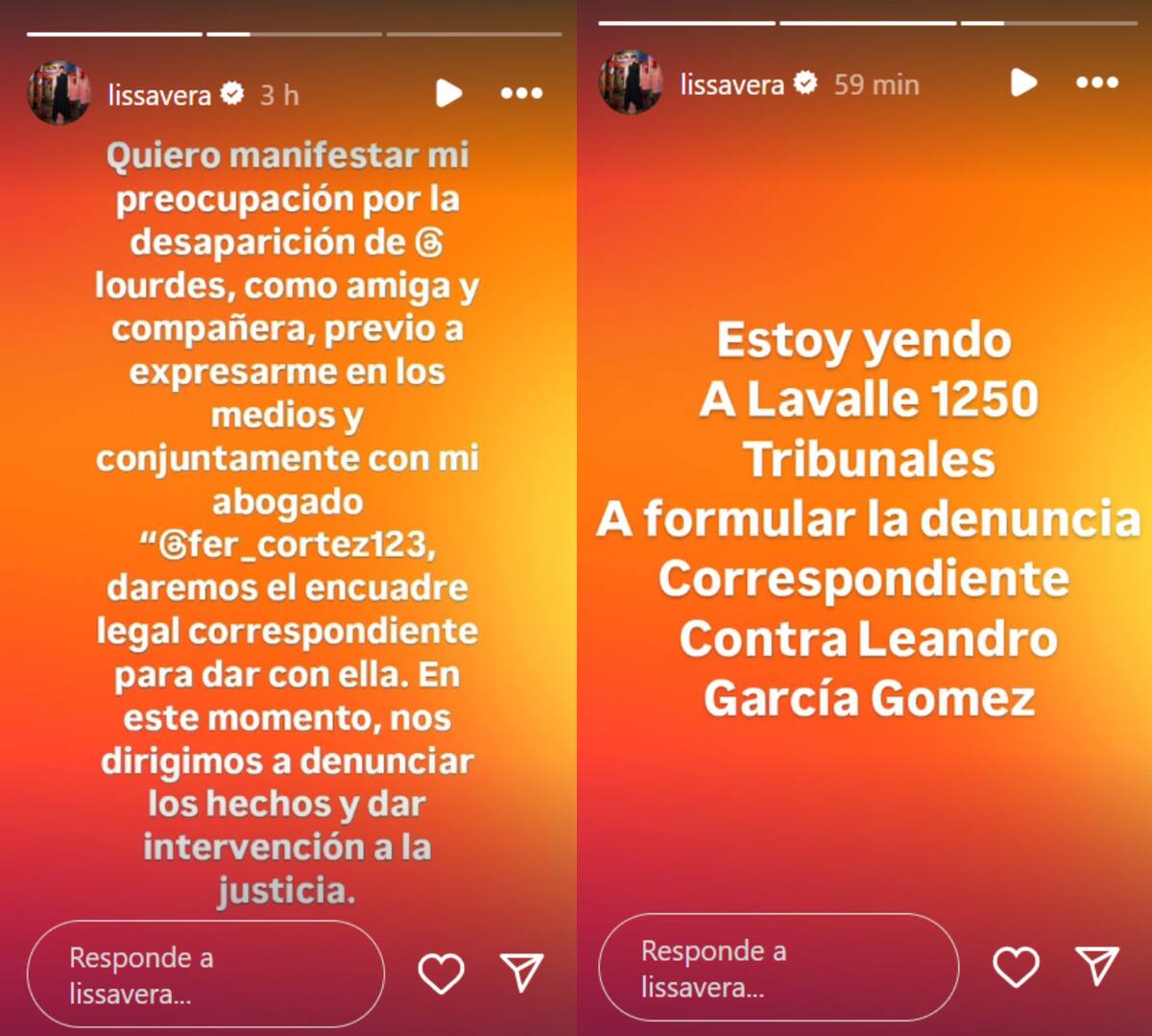 “Esto yendo a Lavalle 1250, Tribunales, a formular la denuncia correspondiente contra Leandro García Gómez”, expresó en la historia que subió en su Instagram.
