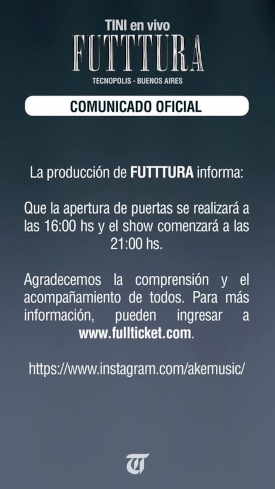La producción publicó un comunicado en los últimos minutos sobre los cambios que se llevarán a cabo en el evento, que se realizará de todas maneras. “Debido a las fuertes lluvias que provocaron el anegamiento de los accesos del público a Tecnópolis, la apertura de puertas se posterga a las 16 y el show comenzará a las 21”, detallaron en primer lugar.