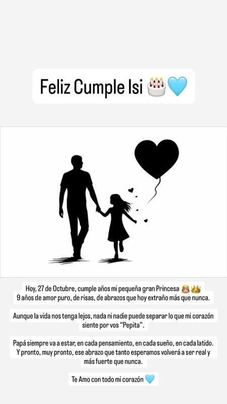 Luego se lamentó por estar lejos de Isabella: “Aunque la vida nos tenga lejos, nada ni nadie puede separar lo que mi corazón siente por vos ‘Pepita’”, agregó.