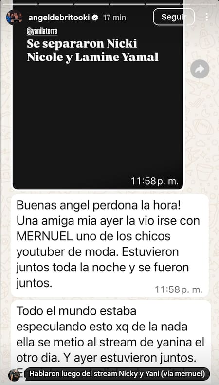 “Una amiga mía ayer la vio irse con Mernuel, uno de los chicos youtuber de moda. Estuvieron juntos toda la noche y se fueron juntos”. La afirmación se suma a diversos rumores que circulaban en redes, adicionando un nuevo capítulo a la historia sentimental de Nicki Nicole, recientemente separada de Lamine Yamal.