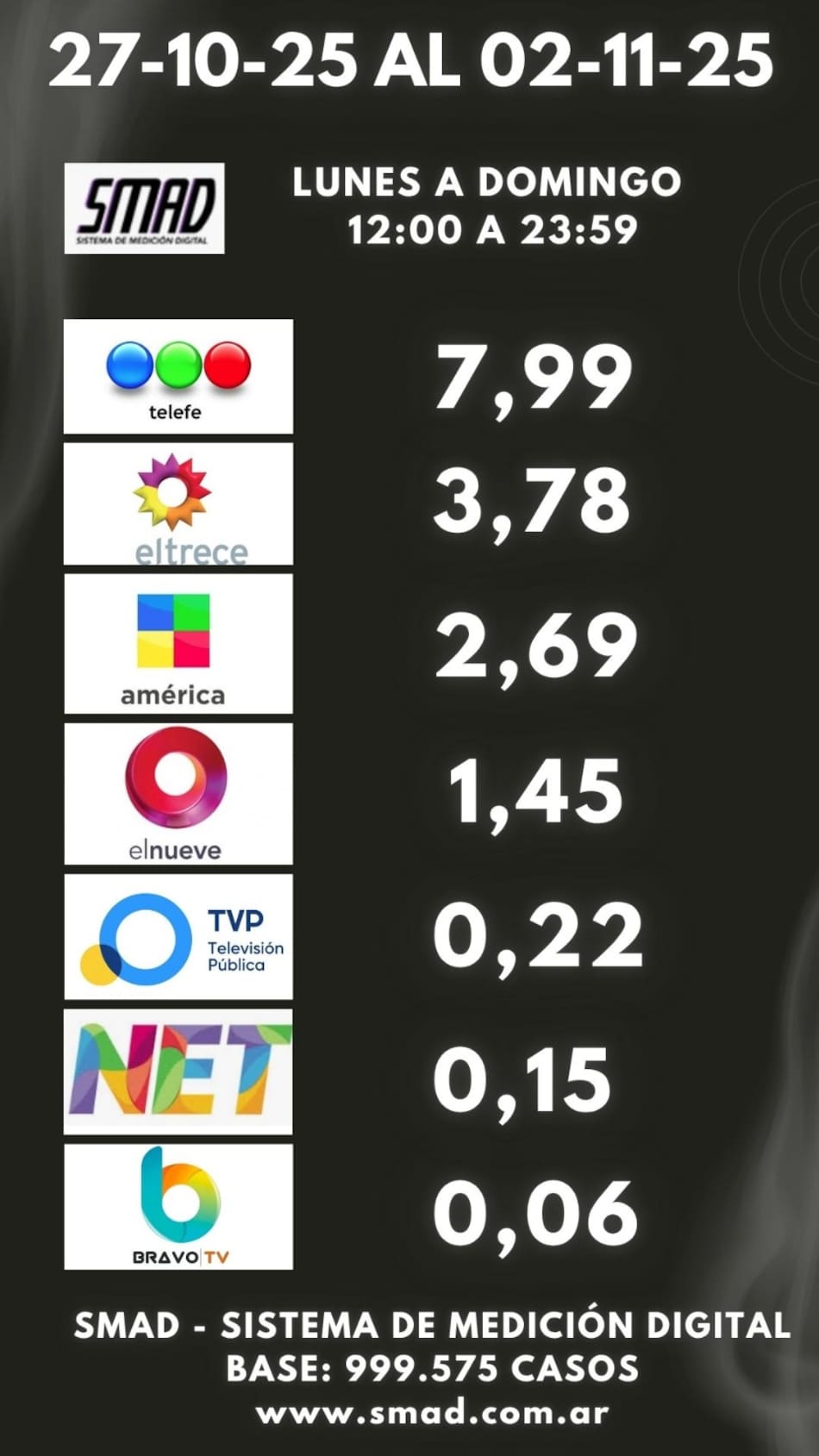 Telefé se impuso de apertura a cierre, entre las 12 y las 23:59 con un promedio de 7,99 puntos de rating, según datos de la medidora de audiencia SMAD (Sistema de Medición de Audiencia Digital).